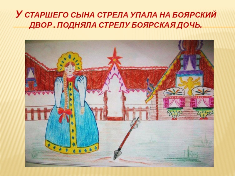 Слайд 4У старшего сына стрела упала на боярский двор . Подняла стрелу