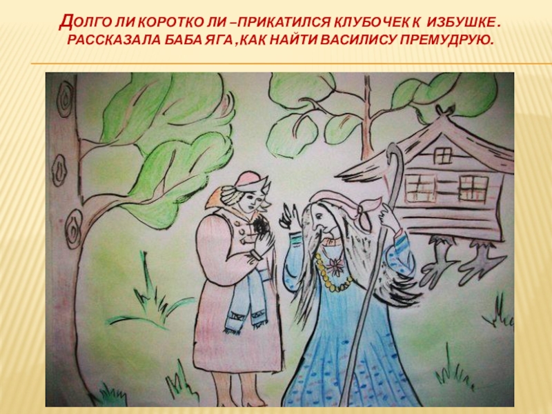 Слайд 18Долго ли коротко ли –прикатился клубочек к избушке . Рассказала Баба