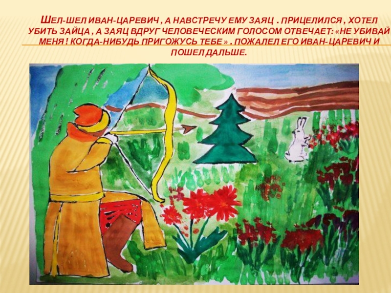 Слайд 16Шел-шел Иван-царевич , а навстречу ему заяц . Прицелился , хотел