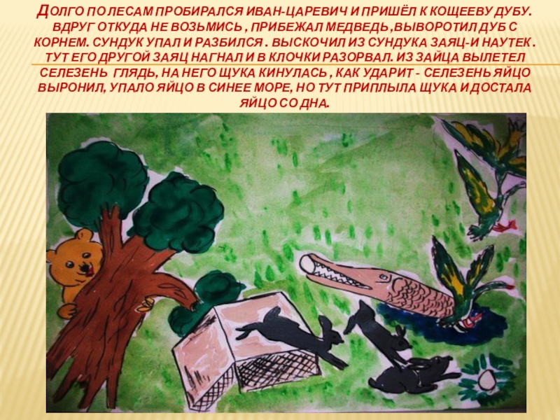 откуда не возьмись , прибежал медведь ,выворотил дуб с корнем. Сундук упал и разбился . Выскочил из сундука заяц-и наутек . Тут его другой заяц нагнал и в клочки разорвал. Из зайца вылетел селезень глядь, на него щука кинулась , как ударит - селезень яйцо выронил, упало яйцо в синее море, но тут приплыла щука и достала яйцо со дна.