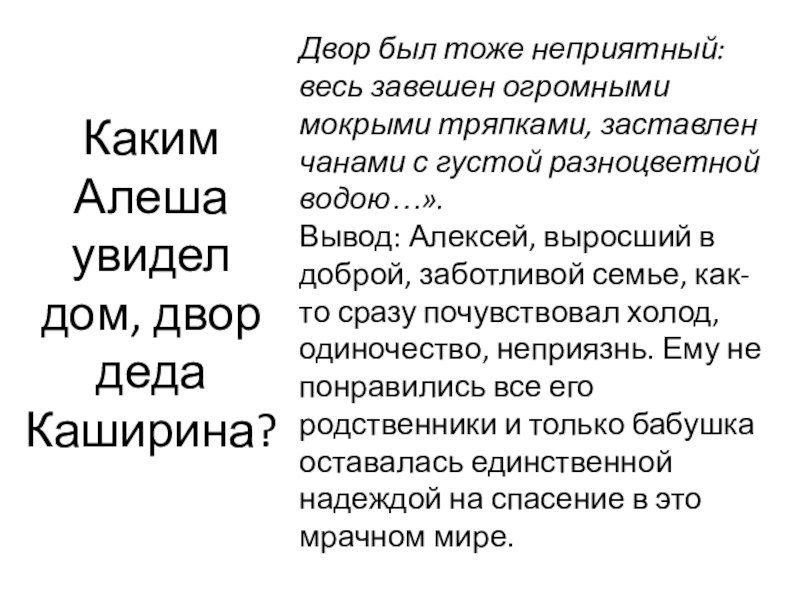 Слайд 17Каким Алеша увидел дом, двор деда Каширина?
