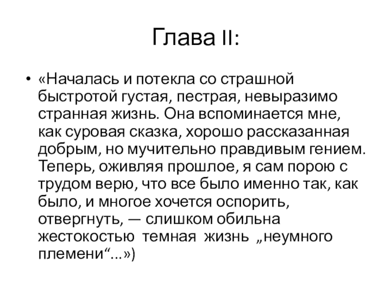 странная жизнь. Она вспоминается мне, как суровая сказка, хорошо рассказанная добрым, но мучительно правдивым гением. Теперь, оживляя прошлое, я сам порою с трудом верю, что все было именно так, как было, и многое хочется оспорить, отвергнуть, — слишком обильна жестокостью темная жизнь „неумного племени“...»)