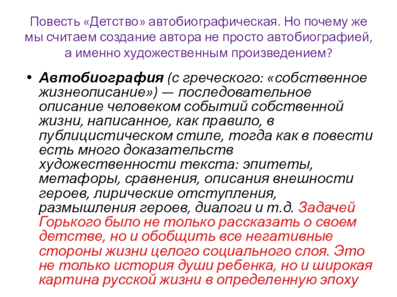 Автобиография (с греческого: «собственное жизнеописание») — последовательное описание человеком событий собственной жизни, написанное, как правило, в публицистическом стиле, тогда как в повести есть много доказательств художественности текста: эпитеты, метафоры, сравнения, описания внешности героев, лирические отступления, размышления героев, диалоги и т.д. Задачей Горького было не только рассказать о своем детстве, но и обобщить все негативные стороны жизни целого социального слоя. Это не только история души ребенка, но и широкая картина русской жизни в определенную эпоху