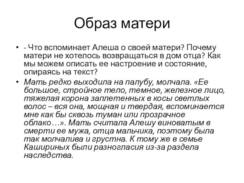 Мать редко выходила на палубу, молчала. «Ее большое, стройное тело, темное, железное лицо, тяжелая корона заплетенных в косы светлых волос – вся она, мощная и твердая, вспоминается мне как бы сквозь туман или прозрачное облако…». Мать считала Алешу виноватым в смерти ее мужа, отца мальчика, поэтому была так молчалива и грустна. К тому же в семье Кашириных были разногласия из-за раздела наследства.