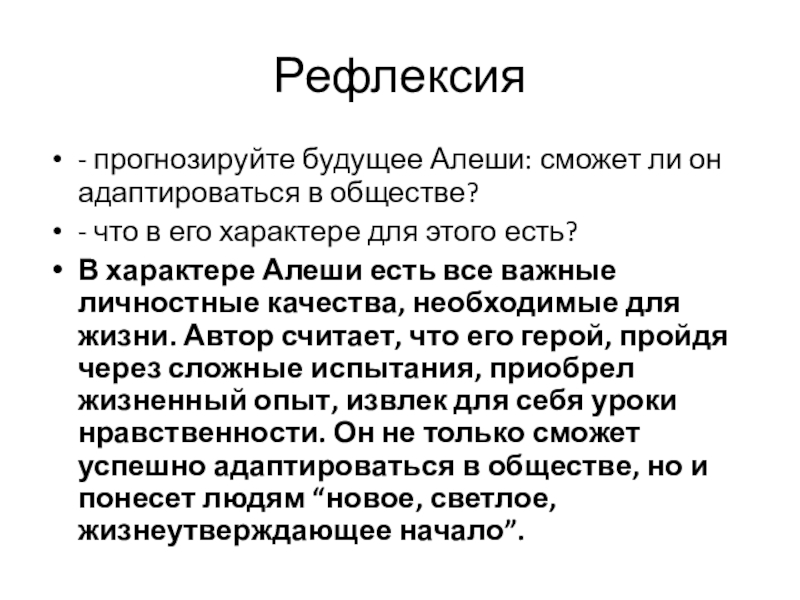 В характере Алеши есть все важные личностные качества, необходимые для жизни. Автор считает, что его герой, пройдя через сложные испытания, приобрел жизненный опыт, извлек для себя уроки нравственности. Он не только сможет успешно адаптироваться в обществе, но и понесет людям “новое, светлое, жизнеутверждающее начало”.