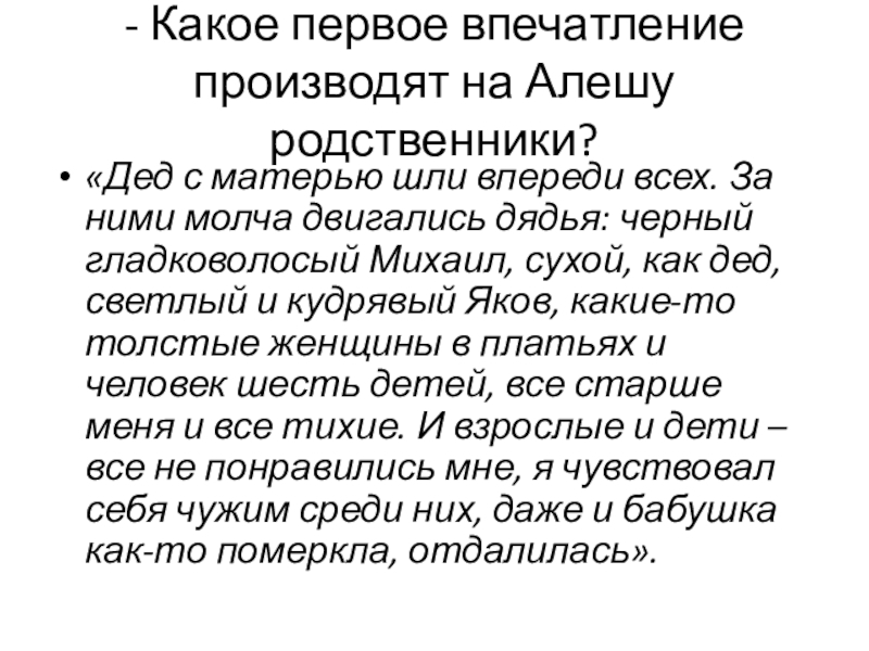 Слайд 16- Какое первое впечатление производят на Алешу родственники?