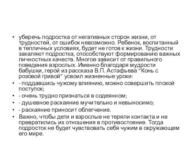 Ребенок, воспитанный в тепличных условиях, будет не готов к жизни. Трудности закаляют подростка, способствуют формированию важных личностных качеств. Многое зависит от правильного поведения взрослых. Именно благодаря мудрости бабушки, герой из рассказа В.П. Астафьева “Конь с розовой гривой” усвоил жизненные уроки: