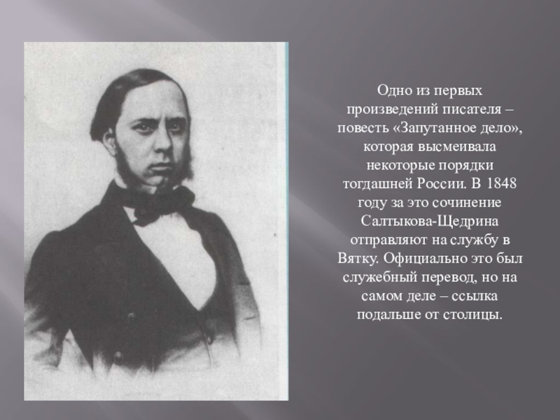 Слайд 6Одно из первых произведений писателя – повесть «Запутанное дело», которая высмеивала