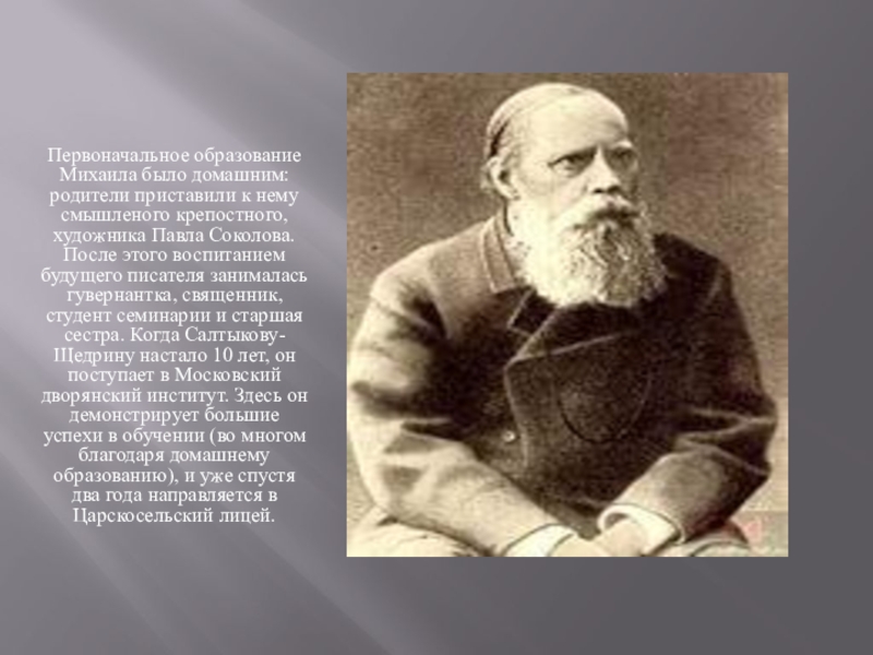 художника Павла Соколова. После этого воспитанием будущего писателя занималась гувернантка, священник, студент семинарии и старшая сестра. Когда Салтыкову-Щедрину настало 10 лет, он поступает в Московский дворянский институт. Здесь он демонстрирует большие успехи в обучении (во многом благодаря домашнему образованию), и уже спустя два года направляется в Царскосельский лицей.