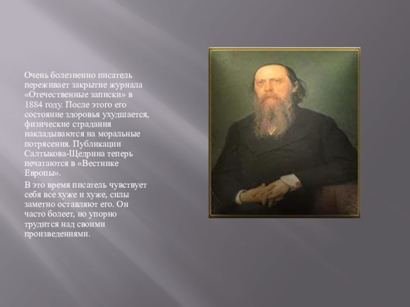 Слайд 12Очень болезненно писатель переживает закрытие журнала «Отечественные записки» в 1884 году.
