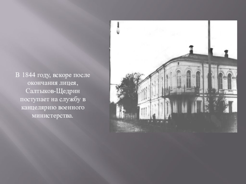 В 1844 году, вскоре после окончания лицея, Салтыков-Щедрин поступает на службу в канцелярию военного министерства.