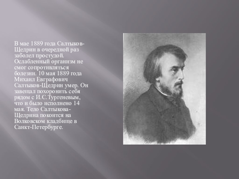 организм не смог сопротивляться болезни. 10 мая 1889 года Михаил Евграфович Салтыков-Щедрин умер. Он завещал похоронить себя рядом с И.С.Тургеневым, что и было исполнено 14 мая. Тело Салтыкова-Щедрина покоится на Волковском кладбище в Санкт-Петербурге.