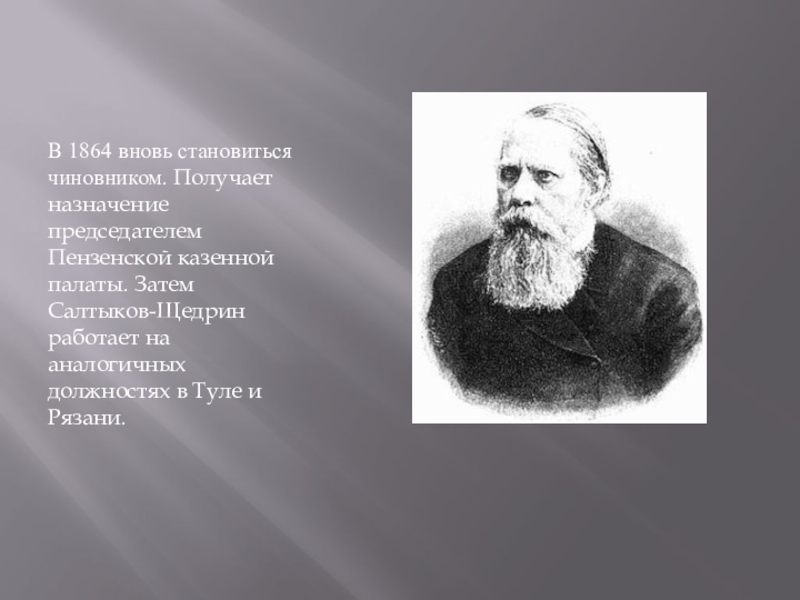 Слайд 10В 1864 вновь становиться чиновником. Получает назначение председателем Пензенской казенной палаты.