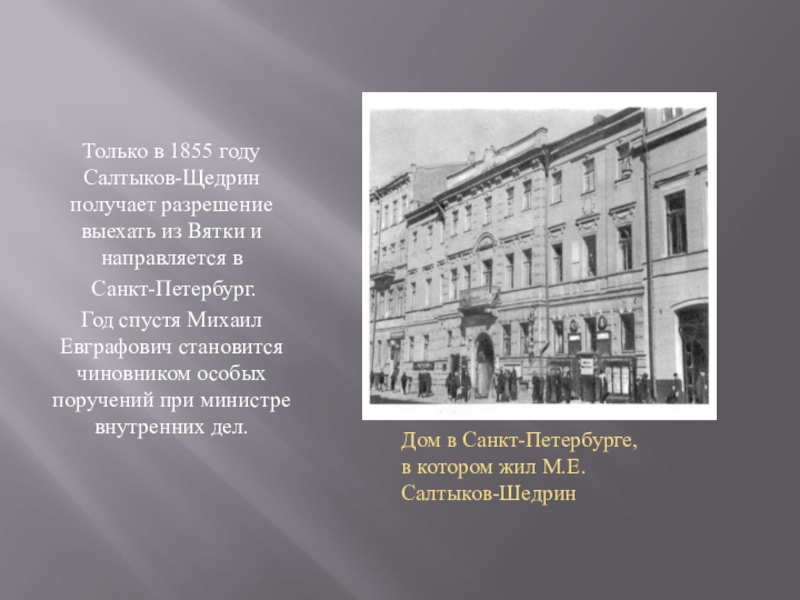 Дом в Санкт-Петербурге, в котором жил М.Е.Салтыков-ШедринТолько в 1855 году Салтыков-Щедрин получает разрешение выехать из Вятки и