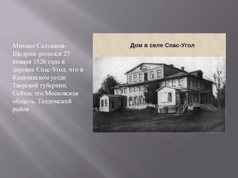 Михаил Салтыков-Щедрин родился 27 января 1826 года в деревне Спас-Угол, что в Калязинском уезде Тверской губернии. Сейчас это Московская область, Талдомский район