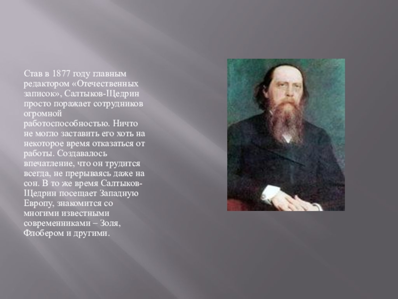 сотрудников огромной работоспособностью. Ничто не могло заставить его хоть на некоторое время отказаться от работы. Создавалось впечатление, что он трудится всегда, не прерываясь даже на сон. В то же время Салтыков-Щедрин посещает Западную Европу, знакомится со многими известными современниками – Золя, Флобером и другими.