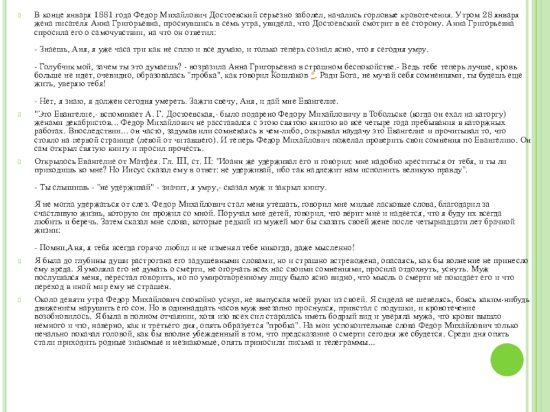 Слайд 7В конце января 1881 года Федор Михайлович Достоевский серьезно заболел, начались горловые кровотечения.