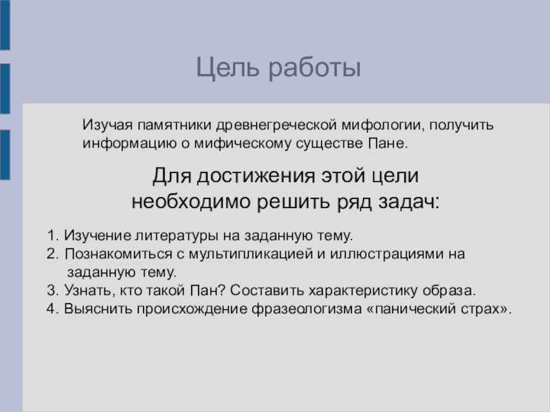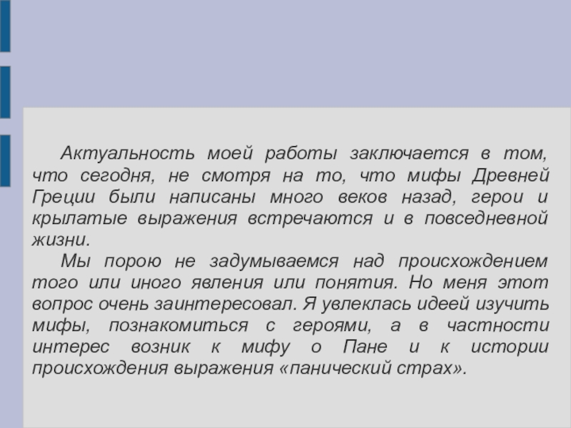 Мы порою не задумываемся над происхождением того или иного явления или понятия. Но меня этот вопрос очень заинтересовал. Я увлеклась идеей изучить мифы, познакомиться с героями, а в частности интерес возник к мифу о Пане и к истории происхождения выражения «панический страх».