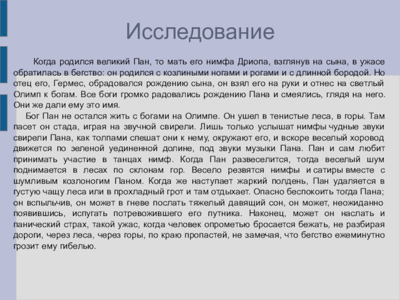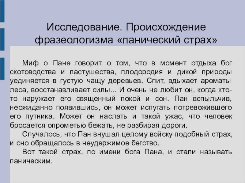 Слайд 8Исследование. Происхождение фразеологизма «панический страх»