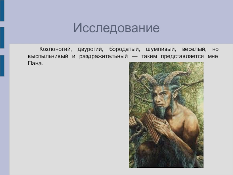 Козлоногий, двурогий, бородатый, шумливый, веселый, но выспыльчивый и раздражительный — таким
