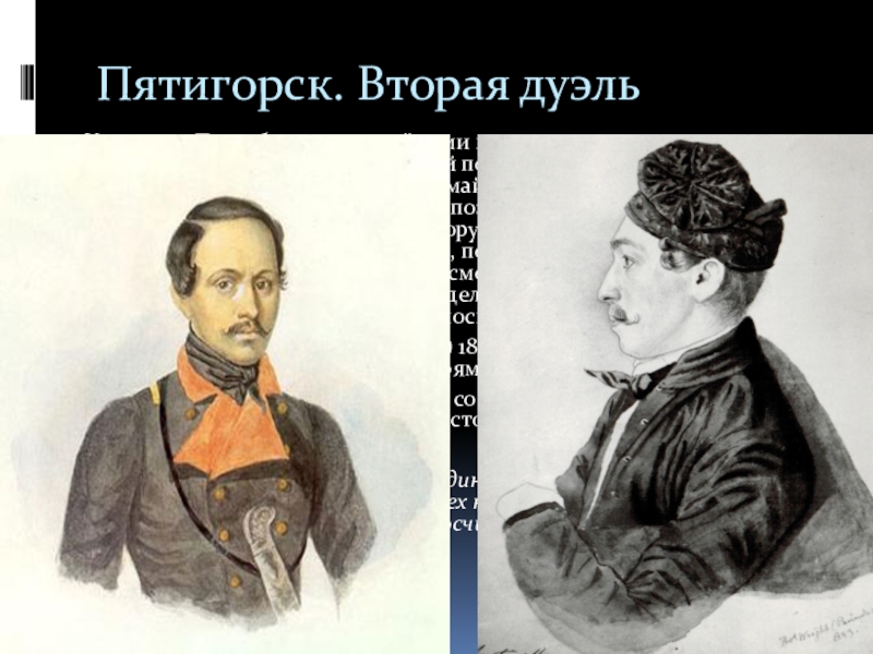 Дуэль произошла 15 июля (27 июля) 1841 года. Лермонтов выстрелил вверх (основная версия), Мартынов — прямо в грудь поэту.