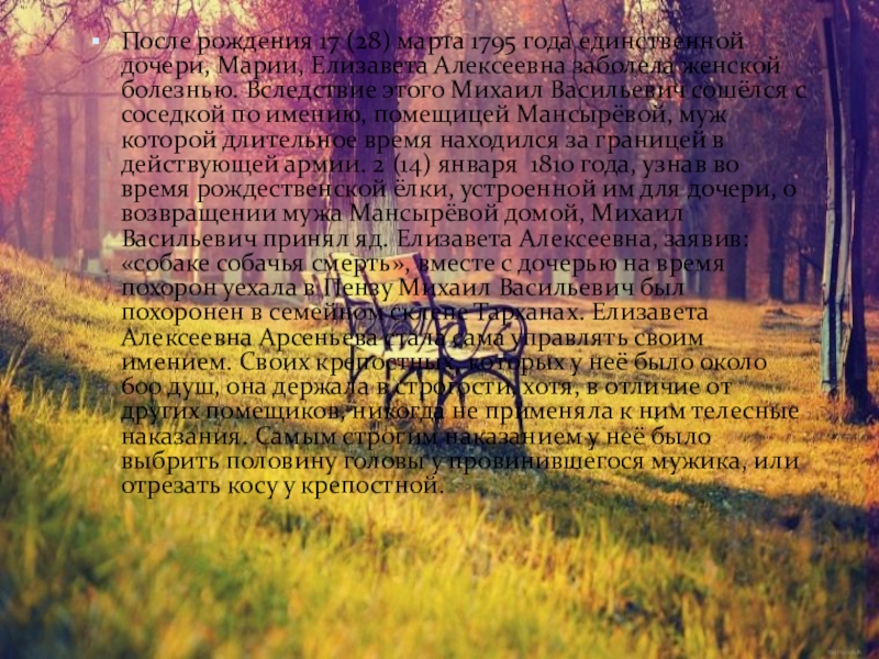 этого Михаил Васильевич сошёлся с соседкой по имению, помещицей Мансырёвой, муж которой длительное время находился за границей в действующей армии. 2 (14) января 1810 года, узнав во время рождественской ёлки, устроенной им для дочери, о возвращении мужа Мансырёвой домой, Михаил Васильевич принял яд. Елизавета Алексеевна, заявив: «собаке собачья смерть», вместе с дочерью на время похорон уехала в Пензу Михаил Васильевич был похоронен в семейном склепе Тарханах. Елизавета Алексеевна Арсеньева стала сама управлять своим имением. Своих крепостных, которых у неё было около 600 душ, она держала в строгости, хотя, в отличие от других помещиков, никогда не применяла к ним телесные наказания. Самым строгим наказанием у неё было выбрить половину головы у провинившегося мужика, или отрезать косу у крепостной.