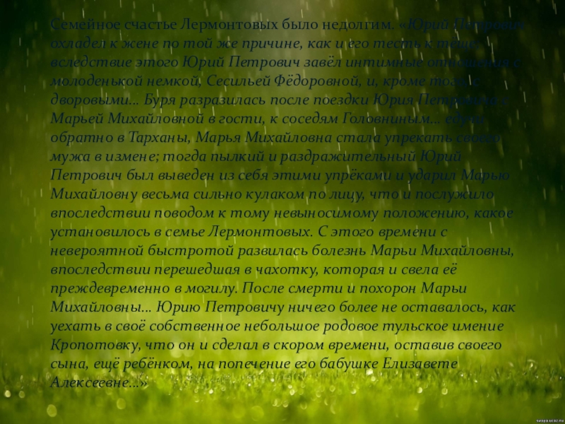 той же причине, как и его тесть к тёще; вследствие этого Юрий Петрович завёл интимные отношения с молоденькой немкой, Сесильей Фёдоровной, и, кроме того, с дворовыми… Буря разразилась после поездки Юрия Петровича с Марьей Михайловной в гости, к соседям Головниным… едучи обратно в Тарханы, Марья Михайловна стала упрекать своего мужа в измене; тогда пылкий и раздражительный Юрий Петрович был выведен из себя этими упрёками и ударил Марью Михайловну весьма сильно кулаком по лицу, что и послужило впоследствии поводом к тому невыносимому положению, какое установилось в семье Лермонтовых. С этого времени с невероятной быстротой развилась болезнь Марьи Михайловны, впоследствии перешедшая в чахотку, которая и свела её преждевременно в могилу. После смерти и похорон Марьи Михайловны… Юрию Петровичу ничего более не оставалось, как уехать в своё собственное небольшое родовое тульское имение Кропотовку, что он и сделал в скором времени, оставив своего сына, ещё ребёнком, на попечение его бабушке Елизавете Алексеевне…»