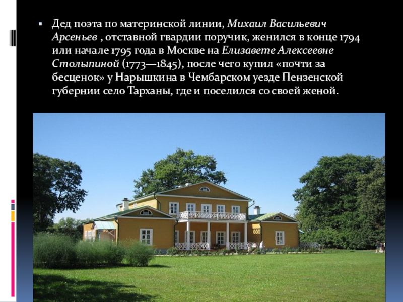Слайд 3Дед поэта по материнской линии, Михаил Васильевич Арсеньев , отставной гвардии поручик, женился
