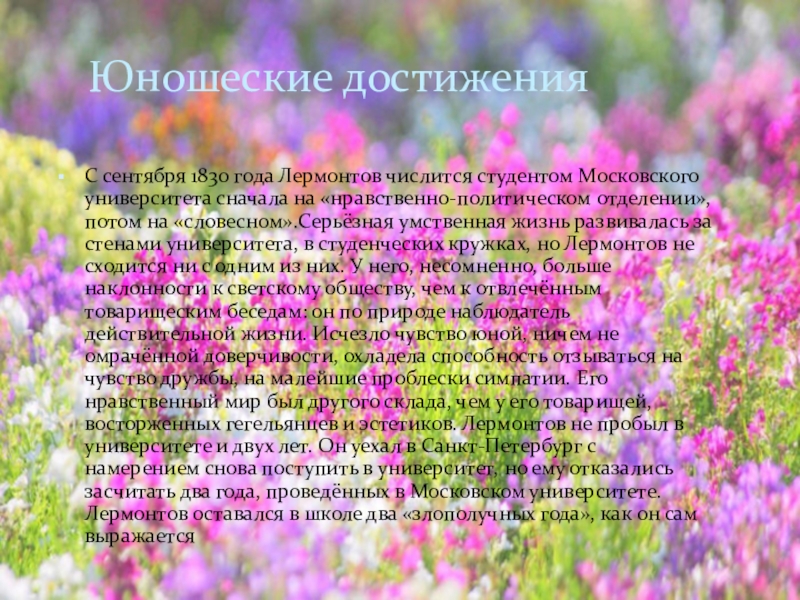 Слайд 9С осени 1825 года начинаются более или менее постоянные учебные занятия Лермонтова, но