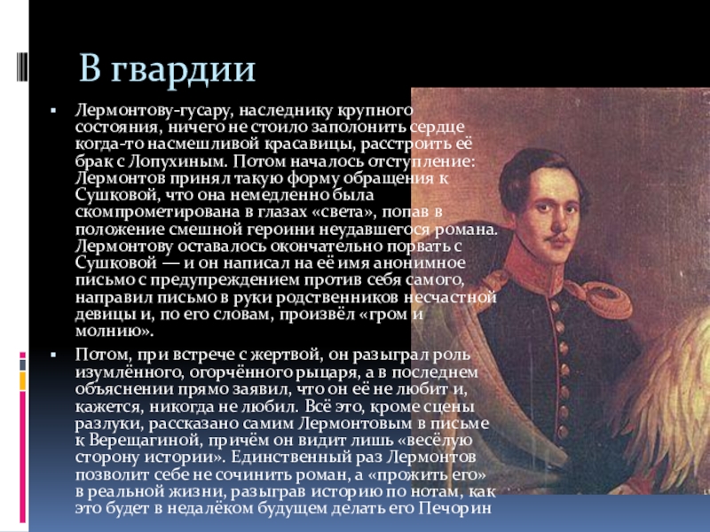 Лермонтову-гусару, наследнику крупного состояния, ничего не стоило заполонить сердце