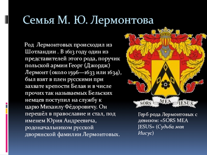 Шотландии . В 1613 году один из представителей этого рода, поручик польской армии Георг (Джордж) Лермонт (около 1596—1633 или 1634), был взят в плен русскими при захвате крепости Белая и в числе прочих так называемых Бельских немцев поступил на службу к царю Михаилу Фёдоровичу. Он перешёл в православие и стал, под именем Юрия Андреевича, родоначальником русской дворянской фамилии Лермонтовых.