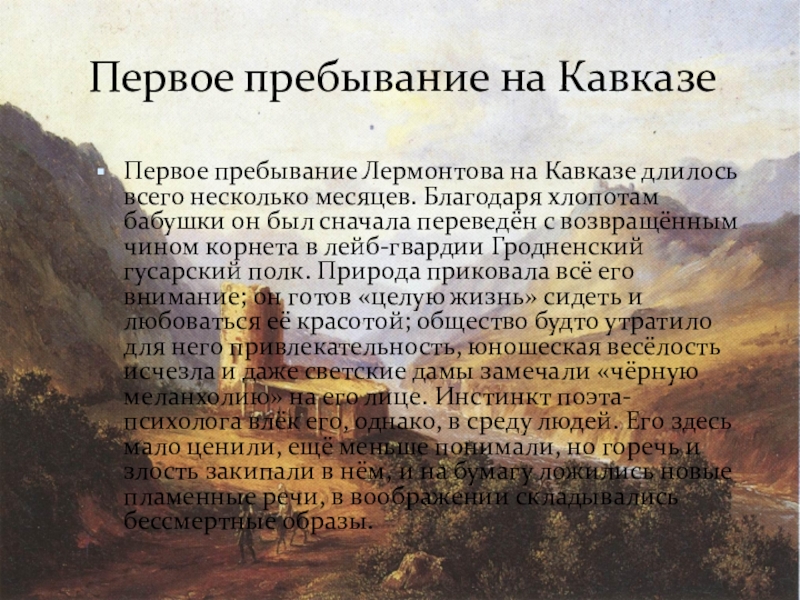 несколько месяцев. Благодаря хлопотам бабушки он был сначала переведён с возвращённым чином корнета в лейб-гвардии Гродненский гусарский полк. Природа приковала всё его внимание; он готов «целую жизнь» сидеть и любоваться её красотой; общество будто утратило для него привлекательность, юношеская весёлость исчезла и даже светские дамы замечали «чёрную меланхолию» на его лице. Инстинкт поэта-психолога влёк его, однако, в среду людей. Его здесь мало ценили, ещё меньше понимали, но горечь и злость закипали в нём, и на бумагу ложились новые пламенные речи, в воображении складывались бессмертные образы.