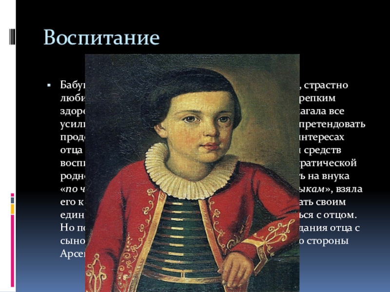 не отличался крепким здоровьем. Энергичная и настойчивая, она прилагала все усилия, чтобы дать ему всё, на что только может претендовать продолжатель рода Лермонтовых. О чувствах и интересах отца она не заботилась. Лермонтов-отец не имел средств воспитывать сына так, как того хотелось аристократической родне, — и Арсеньева, имея возможность тратить на внука «по четыре тысячи в год на обучение разным языкам», взяла его к себе с уговором воспитывать до 16 лет, сделать своим единственным наследником и во всём советоваться с отцом. Но последнее условие не выполнялось; даже свидания отца с сыном встречали непреодолимые препятствия со стороны Арсеньевой.