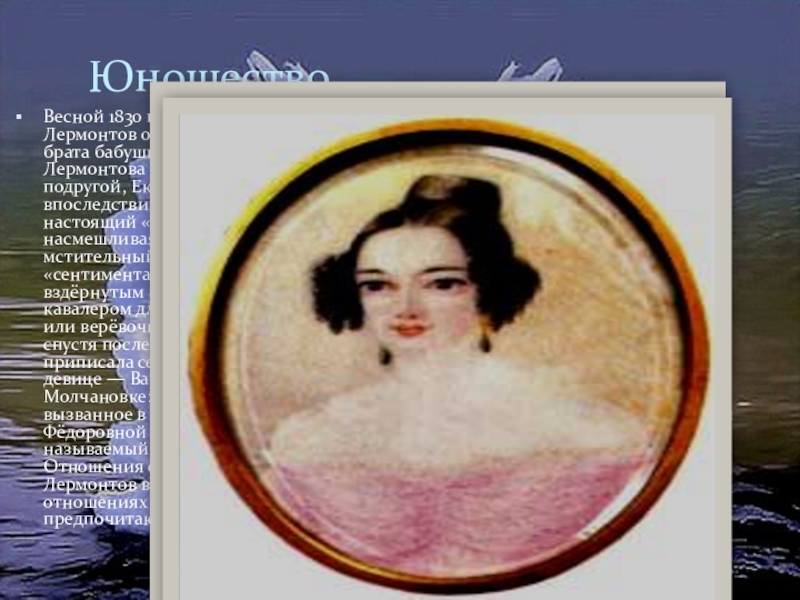 он провёл в Середникове, подмосковном поместье брата бабушки. Недалеко от Середниково жили другие родственники Лермонтова — Верещагины; Александра Верещагина познакомила его со своей подругой, Екатериной Сушковой, также соседкой по имению. Сушкова, впоследствии Хвостова, оставила записки об этом знакомстве. Содержание их — настоящий «роман», распадающийся на две части: в первой — торжествующая и насмешливая героиня, Сушкова, во второй — холодный и даже жестоко мстительный герой, Лермонтов.Шестнадцатилетний «отрок», склонный к «сентиментальным суждениям», невзрачный, косолапый, с красными глазами, с вздёрнутым носом и язвительной улыбкой, менее всего мог казаться интересным кавалером для юных барышень. В ответ на его чувства ему предлагали «волчок или верёвочку», угощали булочками с начинкой из опилок. Сушкова, много лет спустя после события, изобразила поэта в недуге безнадёжной страсти и приписала себе даже стихотворение, посвящённое Лермонтовым другой девице — Вареньке Лопухиной, его соседке по московской квартире на Малой Молчановке: к ней он питал до конца жизни самое глубокое чувство, когда-либо вызванное в нём женщиной. В 1830 году происходит знакомство поэта с Натальей Фёдоровной Ива́новой, — таинственной незнакомкой Н. Ф. И. Ей посвящён так называемый «ивановский цикл» из приблизительно тридцати стихов. Отношения с Ивановой первоначально развивались иначе, чем с Сушковой, — Лермонтов впервые почувствовал взаимное чувство. Однако вскоре в их отношениях наступает непонятная перемена, пылкому, молодому поэту предпочитают более опытного и состоятельного соперника.