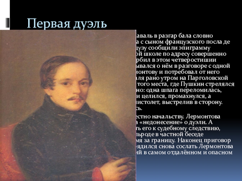 бала словно невзначай вспыхнула ссора Лермонтова с сыном французского посла де Баранта — Эрнестом. Молодому французу сообщили эпиграмму Лермонтова, писанную ещё в юнкерской школе по адресу совершенно другого лица, и уверили, что поэт оскорбил в этом четверостишии именно его, да ещё будто бы дурно отзывался о нём в разговоре с одной дамой. На балу Барант подошёл к Лермонтову и потребовал от него объяснений. Дуэль состоялась 18 февраля рано утром на Парголовской дороге, за Чёрной речкой, недалеко от того места, где Пушкин стрелялся с Дантесом. Дуэль окончилась бескровно: одна шпага переломилась, перешли на пистолеты, и Барант, хотя и целился, промахнулся, а Лермонтов уже после этого разрядил пистолет, выстрелив в сторону. Противники помирились и разъехались.