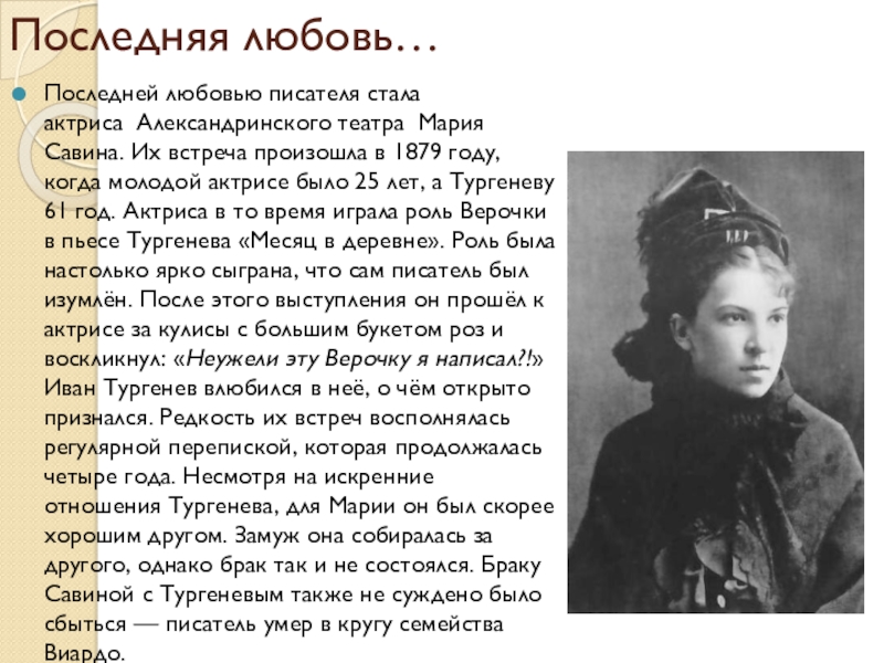 встреча произошла в 1879 году, когда молодой актрисе было 25 лет, а Тургеневу 61 год. Актриса в то время играла роль Верочки в пьесе Тургенева «Месяц в деревне». Роль была настолько ярко сыграна, что сам писатель был изумлён. После этого выступления он прошёл к актрисе за кулисы с большим букетом роз и воскликнул: «Неужели эту Верочку я написал?!»Иван Тургенев влюбился в неё, о чём открыто признался. Редкость их встреч восполнялась регулярной перепиской, которая продолжалась четыре года. Несмотря на искренние отношения Тургенева, для Марии он был скорее хорошим другом. Замуж она собиралась за другого, однако брак так и не состоялся. Браку Савиной с Тургеневым также не суждено было сбыться — писатель умер в кругу семейства Виардо.