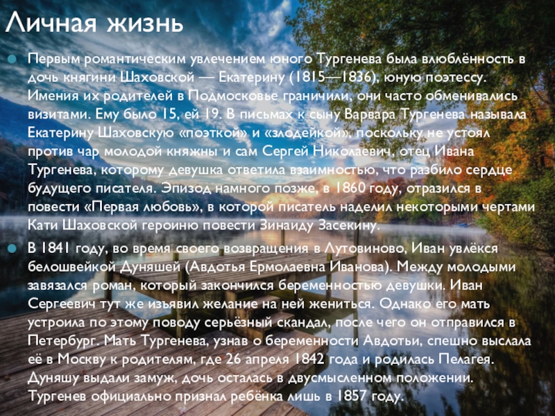 Первым романтическим увлечением юного Тургенева была влюблённость в дочь княгини Шаховской — Екатерину (1815—1836),