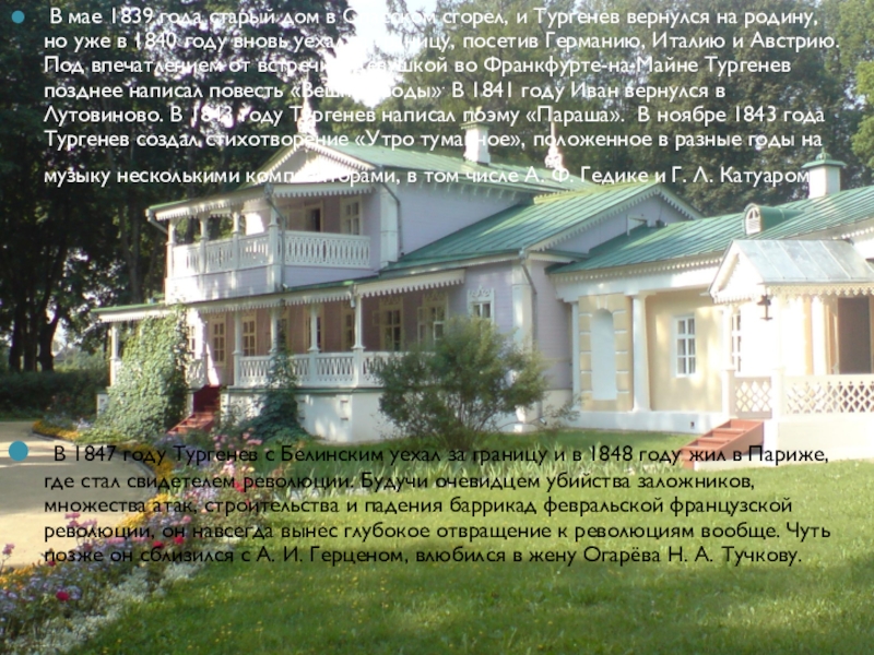 Слайд 4 В мае 1839 года старый дом в Спасском сгорел, и Тургенев вернулся на