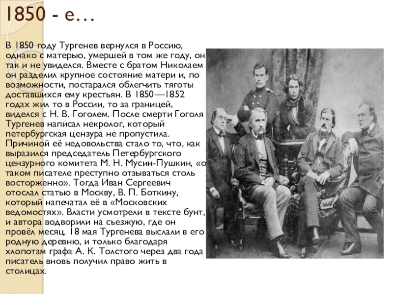 в том же году, он так и не увиделся. Вместе с братом Николаем он разделил крупное состояние матери и, по возможности, постарался облегчить тяготы доставшихся ему крестьян. В 1850—1852 годах жил то в России, то за границей, виделся с Н. В. Гоголем. После смерти Гоголя Тургенев написал некролог, который петербургская цензура не пропустила. Причиной её недовольства стало то, что, как выразился председатель Петербургского цензурного комитета М. Н. Мусин-Пушкин, «о таком писателе преступно отзываться столь восторженно». Тогда Иван Сергеевич отослал статью в Москву, В. П. Боткину, который напечатал её в «Московских ведомостях». Власти усмотрели в тексте бунт, и автора водворили на съезжую, где он провёл месяц. 18 мая Тургенева выслали в его родную деревню, и только благодаря хлопотам графа А. К. Толстого через два года писатель вновь получил право жить в столицах.