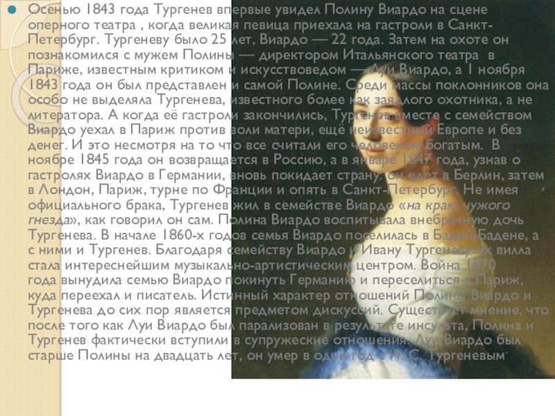 Слайд 8Осенью 1843 года Тургенев впервые увидел Полину Виардо на сцене оперного театра , когда великая