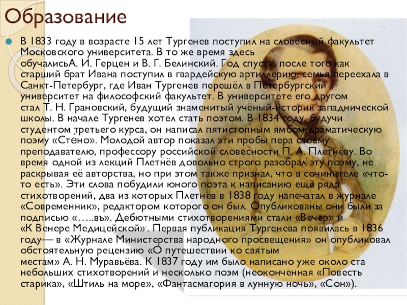 университета. В то же время здесь обучалисьА. И. Герцен и В. Г. Белинский. Год спустя, после того как старший брат Ивана поступил в гвардейскую артиллерию, семья переехала в Санкт-Петербург, где Иван Тургенев перешёл в Петербургский университет на философский факультет. В университете его другом стал Т. Н. Грановский, будущий знаменитый учёный-историк западнической школы. В начале Тургенев хотел стать поэтом. В 1834 году, будучи студентом третьего курса, он написал пятистопным ямбом драматическую поэму «Сте́но». Молодой автор показал эти пробы пера своему преподавателю, профессору российской словесности П. А. Плетнёву. Во время одной из лекций Плетнёв довольно строго разобрал эту поэму, не раскрывая её авторства, но при этом также признал, что в сочинителе «что-то есть». Эти слова побудили юного поэта к написанию ещё ряда стихотворений, два из которых Плетнёв в 1838 году напечатал в журнале «Современник», редактором которого он был. Опубликованы они были за подписью «…..въ». Дебютными стихотворениями стали «Вечер» и «К Венере Медицейской».. Первая публикация Тургенева появилась в 1836 году— в «Журнале Министерства народного просвещения» он опубликовал обстоятельную рецензию «О путешествии ко святым местам» А. Н. Муравьёва. К 1837 году им было написано уже около ста небольших стихотворений и несколько поэм (неоконченная «Повесть старика», «Штиль на море», «Фантасмагория в лунную ночь», «Сон»).