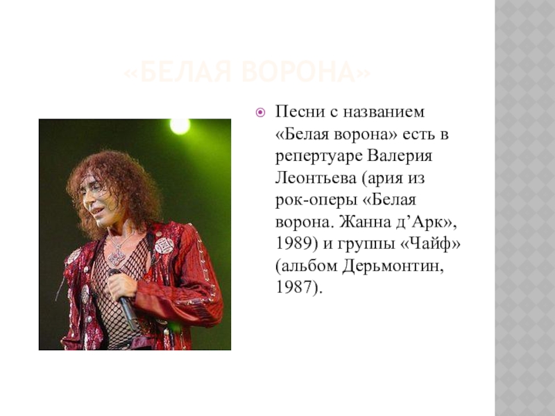 Песни с названием «Белая ворона» есть в репертуаре Валерия Леонтьева