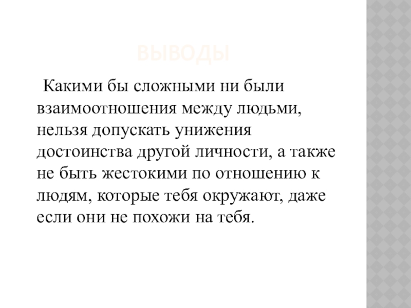 допускать унижения достоинства другой личности, а также не быть жестокими по отношению к людям, которые тебя окружают, даже если они не похожи на тебя.