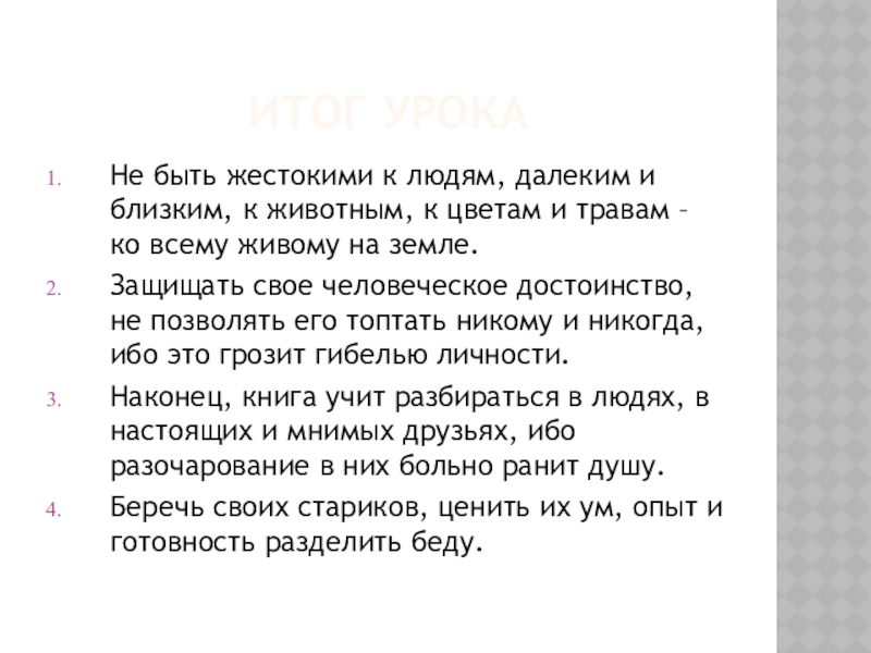 Защищать свое человеческое достоинство, не позволять его топтать никому и никогда, ибо это грозит гибелью личности.
