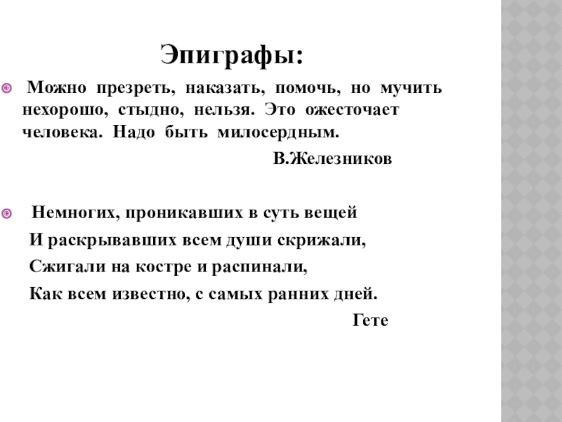 Можно презреть, наказать, помочь, но мучить нехорошо, стыдно, нельзя. Это ожесточает человека. Надо быть милосердным.