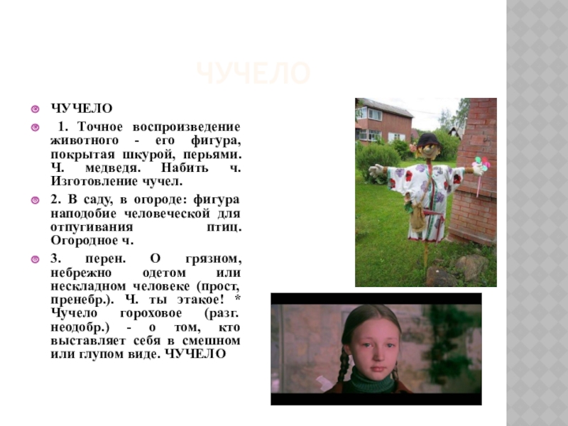 3. перен. О грязном, небрежно одетом или нескладном человеке (прост, пренебр.). Ч. ты этакое! * Чучело гороховое (разг. неодобр.) - о том, кто выставляет себя в смешном или глупом виде. ЧУЧЕЛО