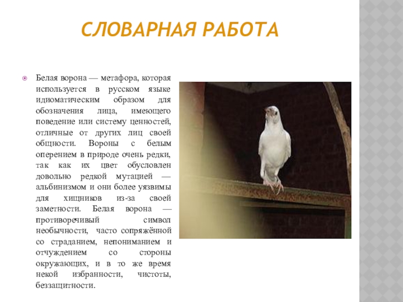 Белая ворона — метафора, которая используется в русском языке идиоматическим