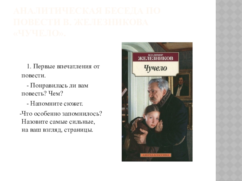 Слайд 5АНАЛИТИЧЕСКАЯ БЕСЕДА ПО ПОВЕСТИ В. ЖЕЛЕЗНИКОВА «ЧУЧЕЛО».