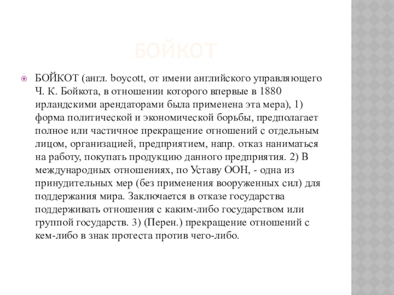 отношении которого впервые в 1880 ирландскими арендаторами была применена эта мера), 1) форма политической и экономической борьбы, предполагает полное или частичное прекращение отношений с отдельным лицом, организацией, предприятием, напр. отказ наниматься на работу, покупать продукцию данного предприятия. 2) В международных отношениях, по Уставу ООН, - одна из принудительных мер (без применения вооруженных сил) для поддержания мира. Заключается в отказе государства поддерживать отношения с каким-либо государством или группой государств. 3) (Перен.) прекращение отношений с кем-либо в знак протеста против чего-либо.