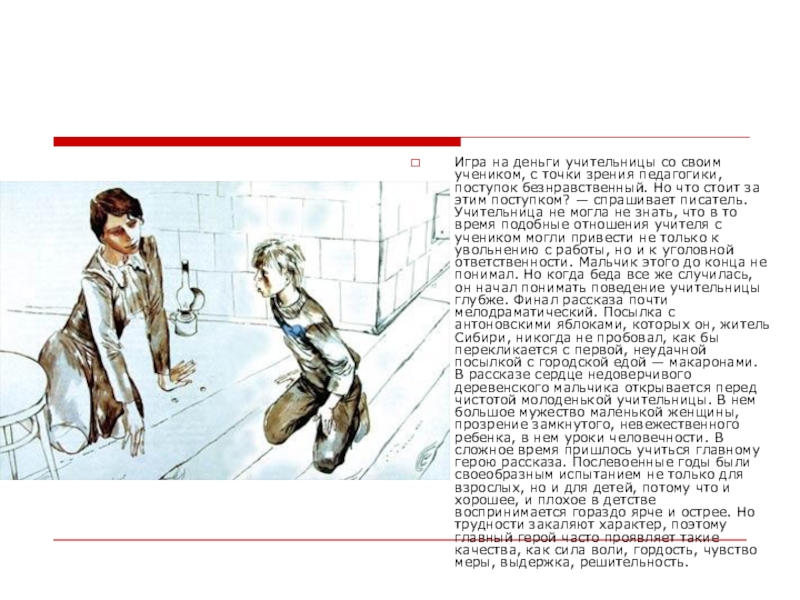 поступок безнравственный. Но что стоит за этим поступком? — спрашивает писатель. Учительница не могла не знать, что в то время подобные отношения учителя с учеником могли привести не только к увольнению с работы, но и к уголовной ответственности. Мальчик этого до конца не понимал. Но когда беда все же случилась, он начал понимать поведение учительницы глубже. Финал рассказа почти мелодраматический. Посылка с антоновскими яблоками, которых он, житель Сибири, никогда не пробовал, как бы перекликается с первой, неудачной посылкой с городской едой — макаронами. В рассказе сердце недоверчивого деревенского мальчика открывается перед чистотой молоденькой учительницы. В нем большое мужество маленькой женщины, прозрение замкнутого, невежественного ребенка, в нем уроки человечности. В сложное время пришлось учиться главному герою рассказа. Послевоенные годы были своеобразным испытанием не только для взрослых, но и для детей, потому что и хорошее, и плохое в детстве воспринимается гораздо ярче и острее. Но трудности закаляют характер, поэтому главный герой часто проявляет такие качества, как сила воли, гордость, чувство меры, выдержка, решительность.